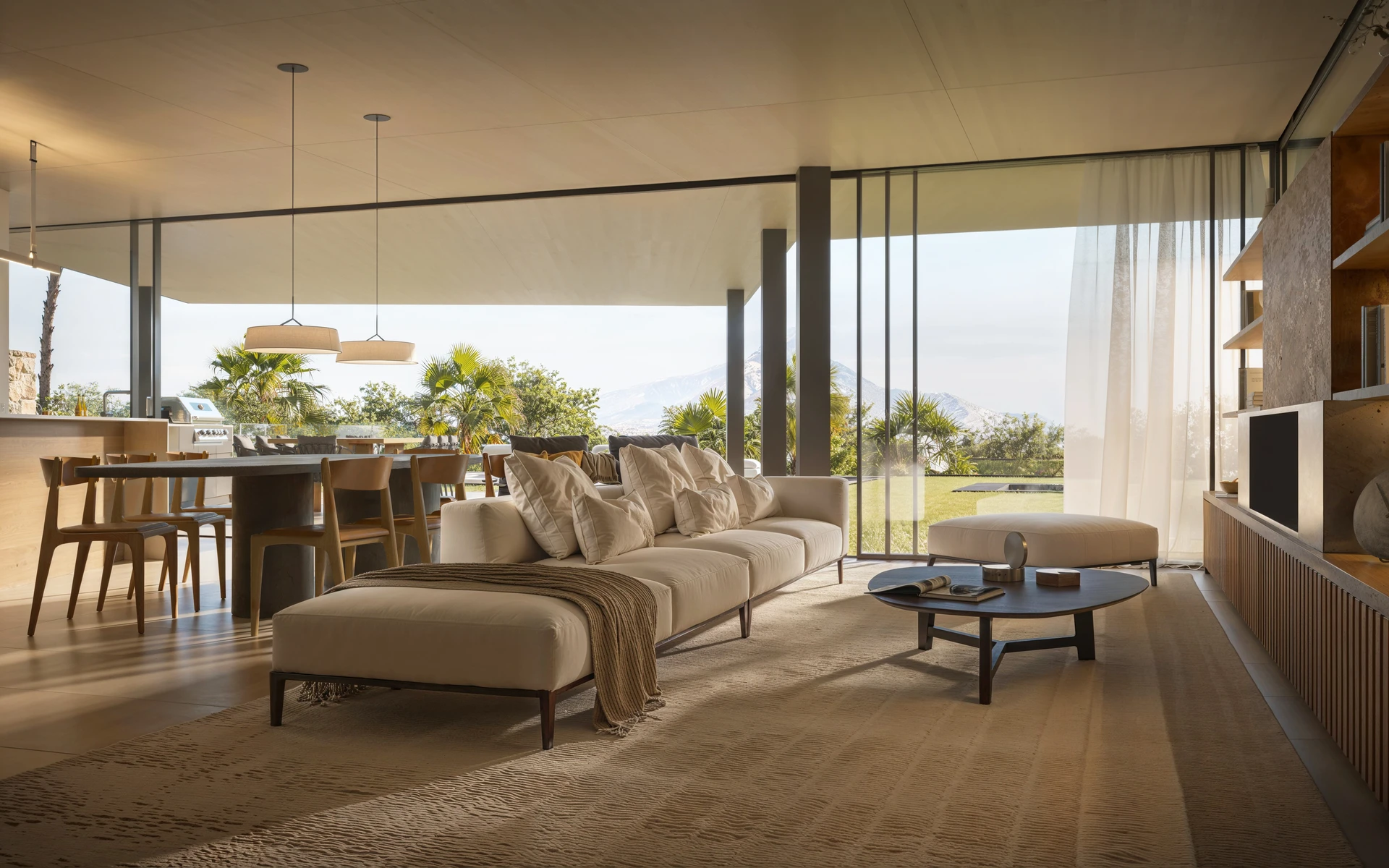Commanding attention with its striking architecture, the villa showcases the use of natural materials that seamlessly integrate with its surroundings. Positioned on an ample plot in the heart of the Golf Valley, the property boasts breathtaking sea views, a manicured garden, and expansive outdoor entertainment spaces, including a private pool, an outdoor kitchenette, and generous terraces designed for alfresco dining and relaxation.